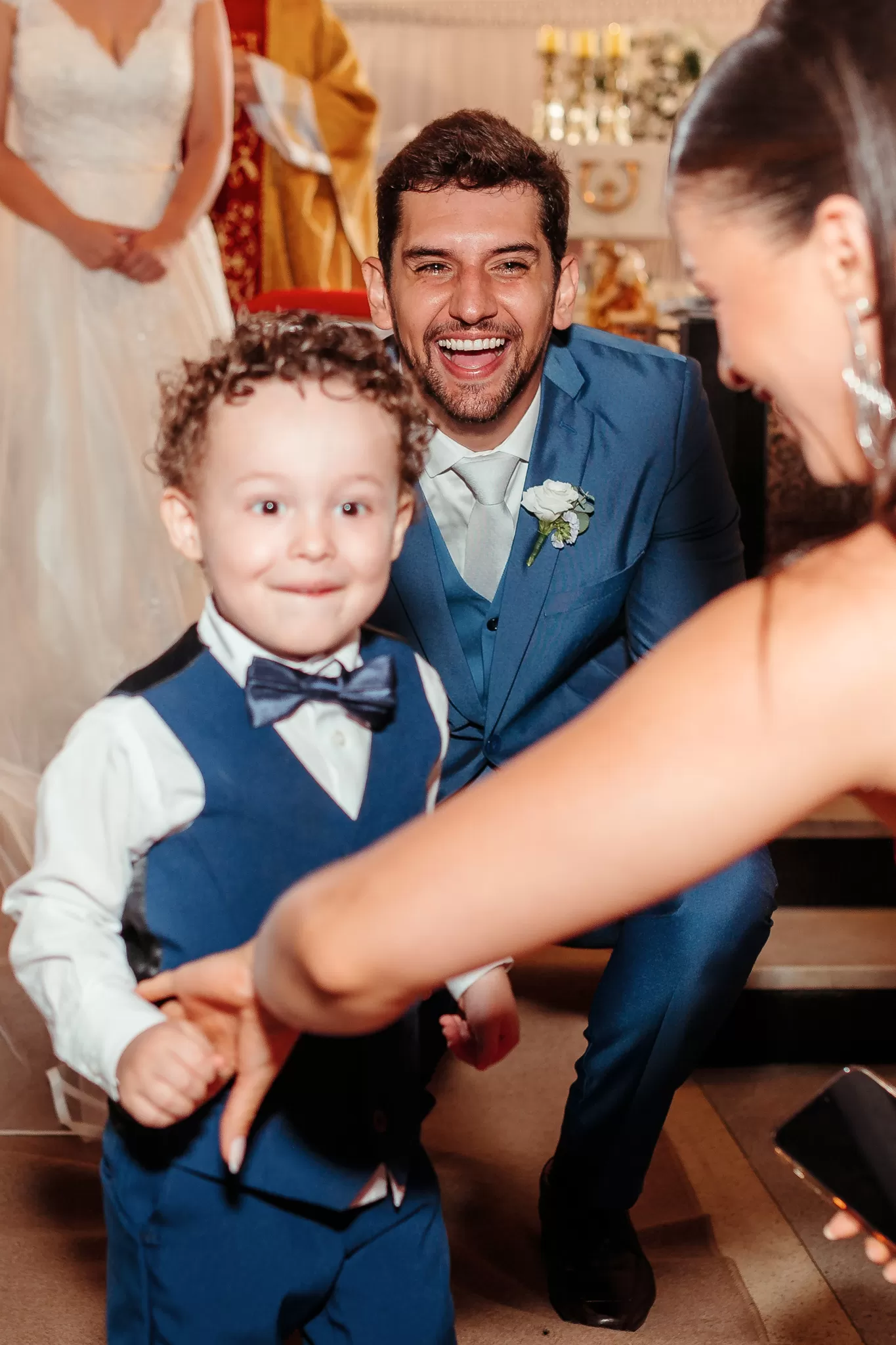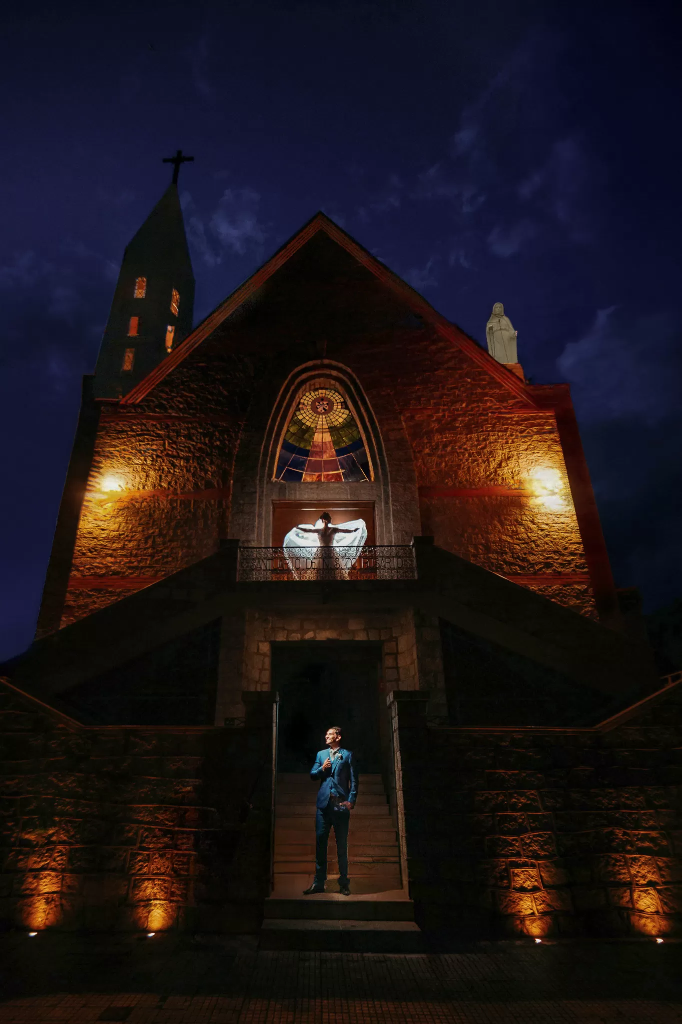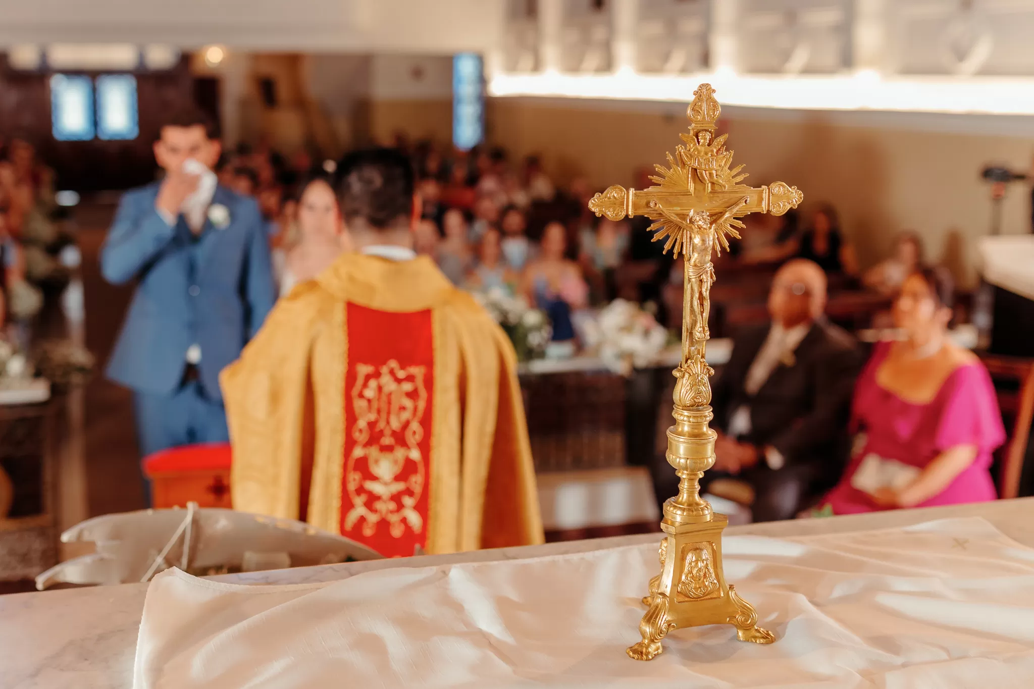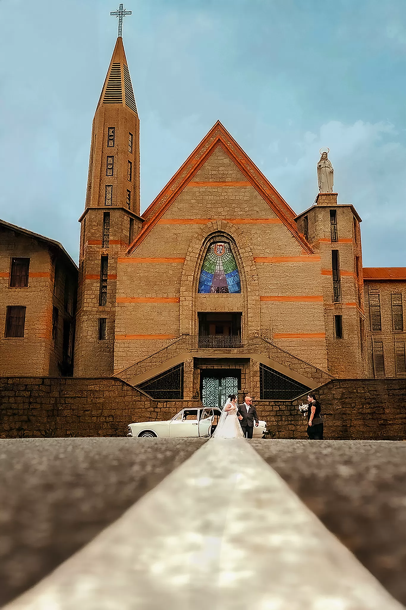 Na igreja, eles me desafiaram a criar um clique especial após a cerimônia. O padre que celebrou é primo da noiva, o que abriu espaço para organizarmos a cena com calma e respeito. Usei a arquitetura, o corredor vazio e a luz criativa para construir um quadro de assinatura que virou favorito do casal e conhecido na região toda.
