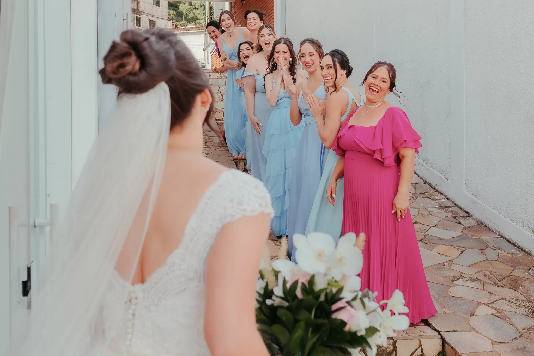 Antes de sair, veio o first look com as madrinhas. Porta abriu, vestido respirou e o ar encheu de gritos, risos e olhos marejados. Foi rápido e verdadeiro, do jeito que momentos bons costumam ser.