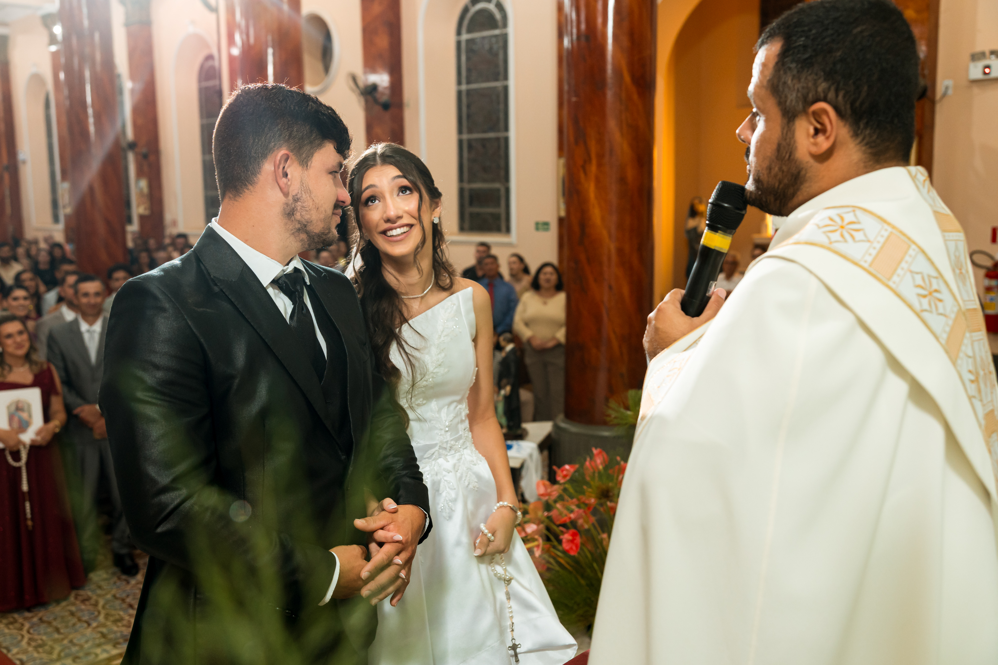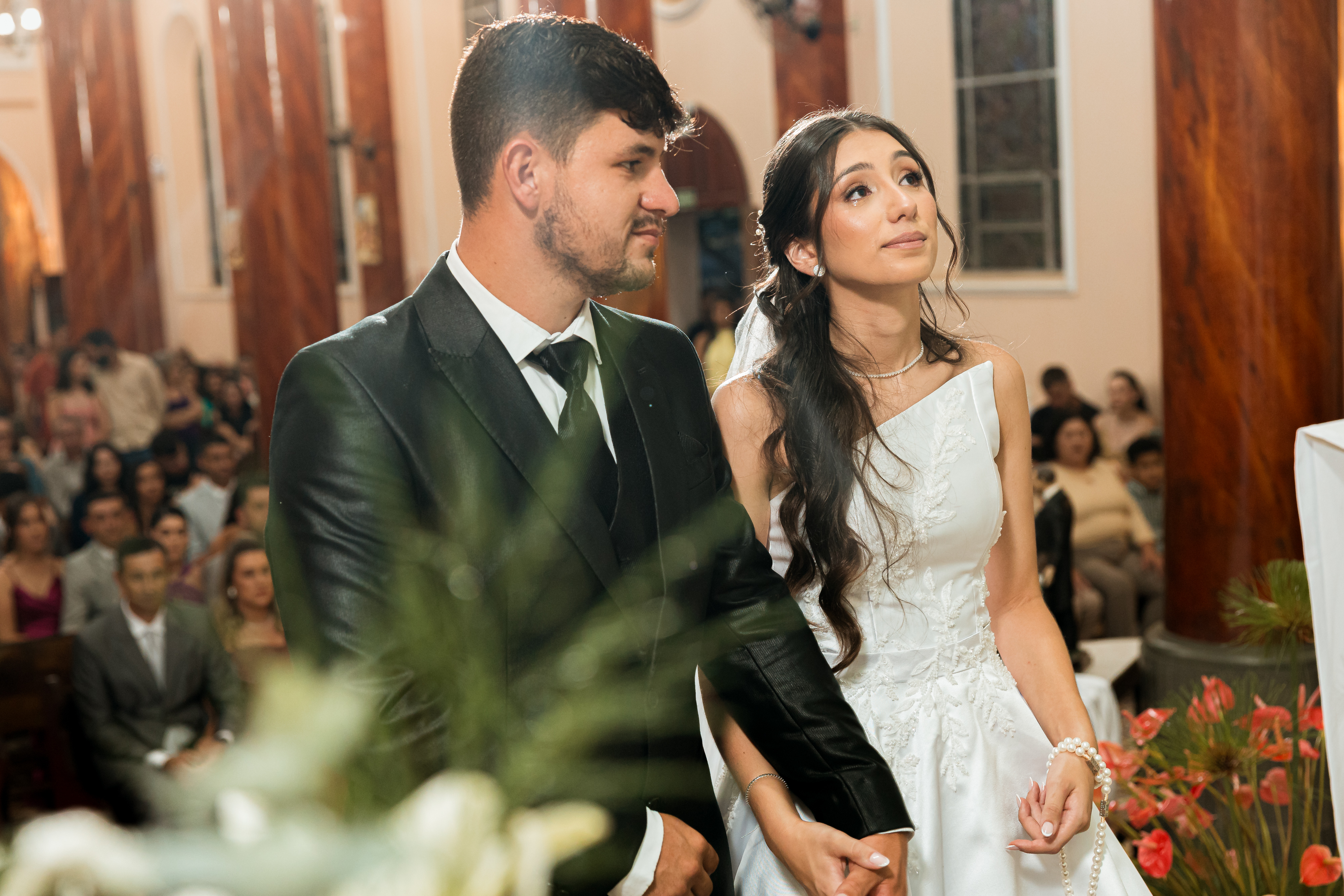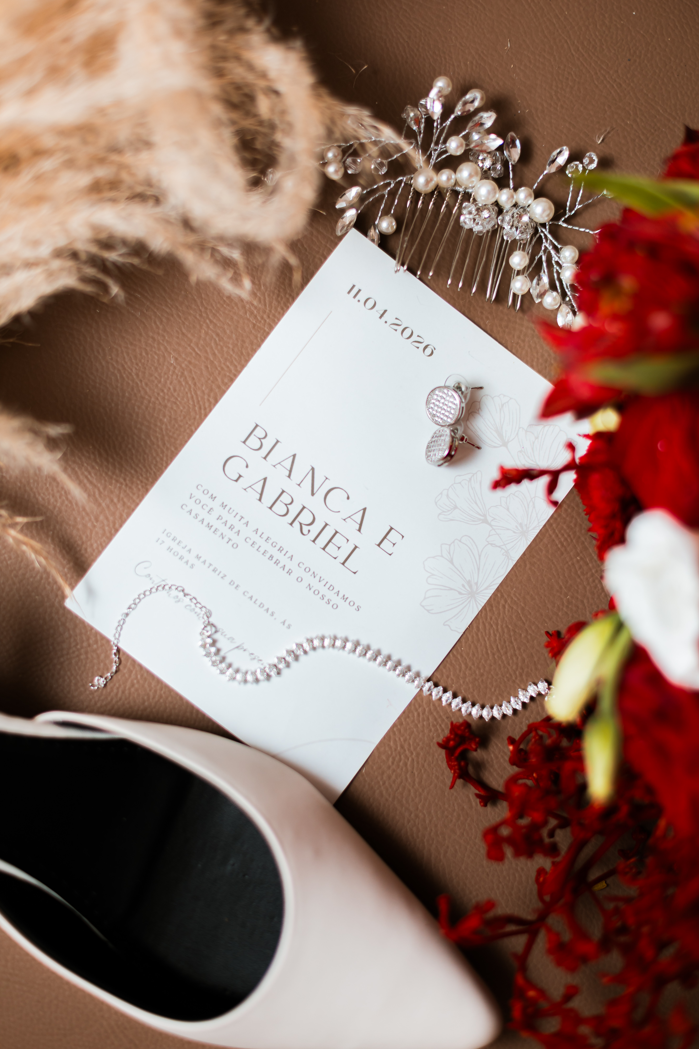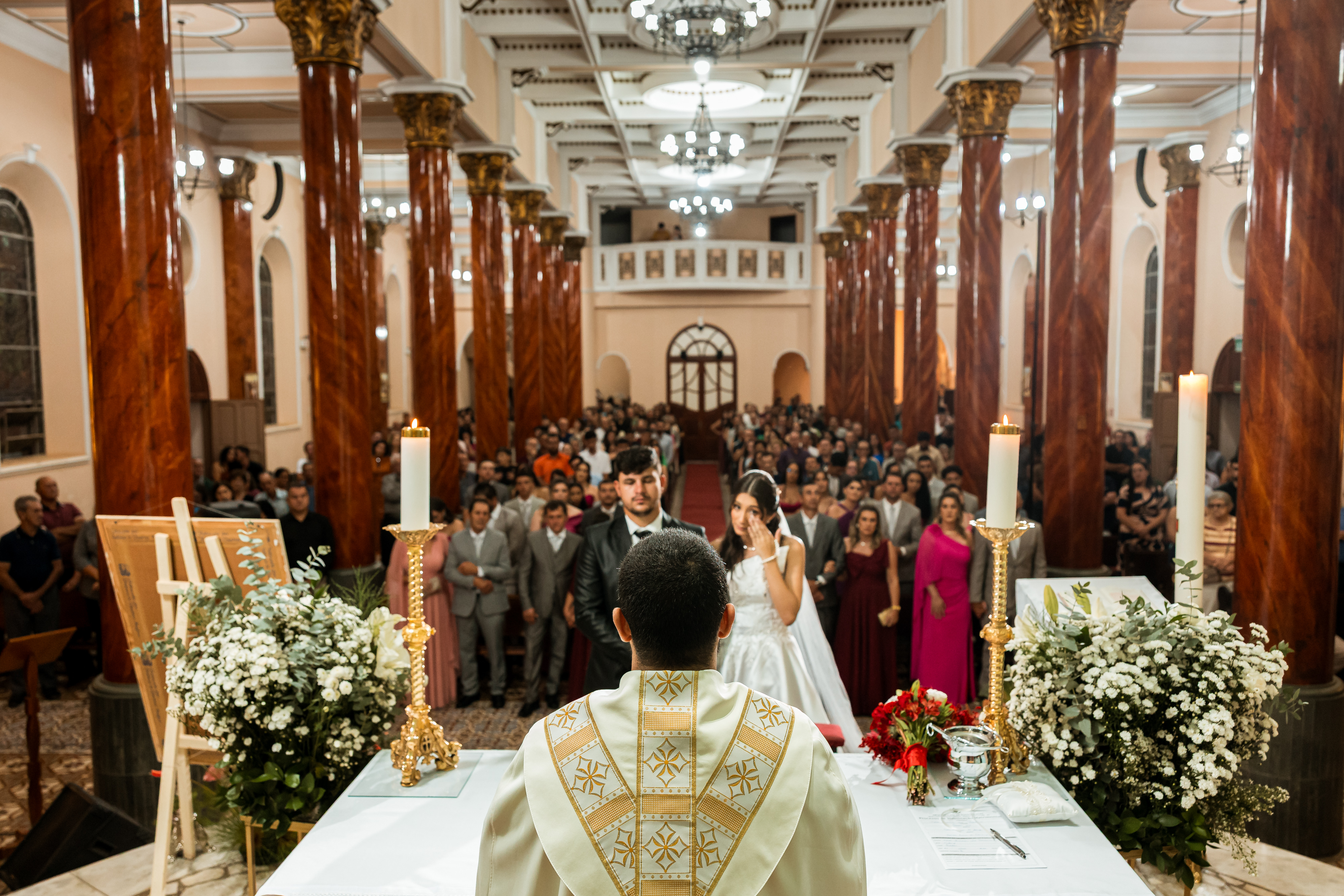 Por isso essa história entra primeiro nesse tempo mais íntimo. O buquê vermelho, os detalhes escolhidos com carinho, os retratos dela pronta e os encontros que antecedem o altar mostram exatamente o que esse dia já era antes da cerimônia começar.