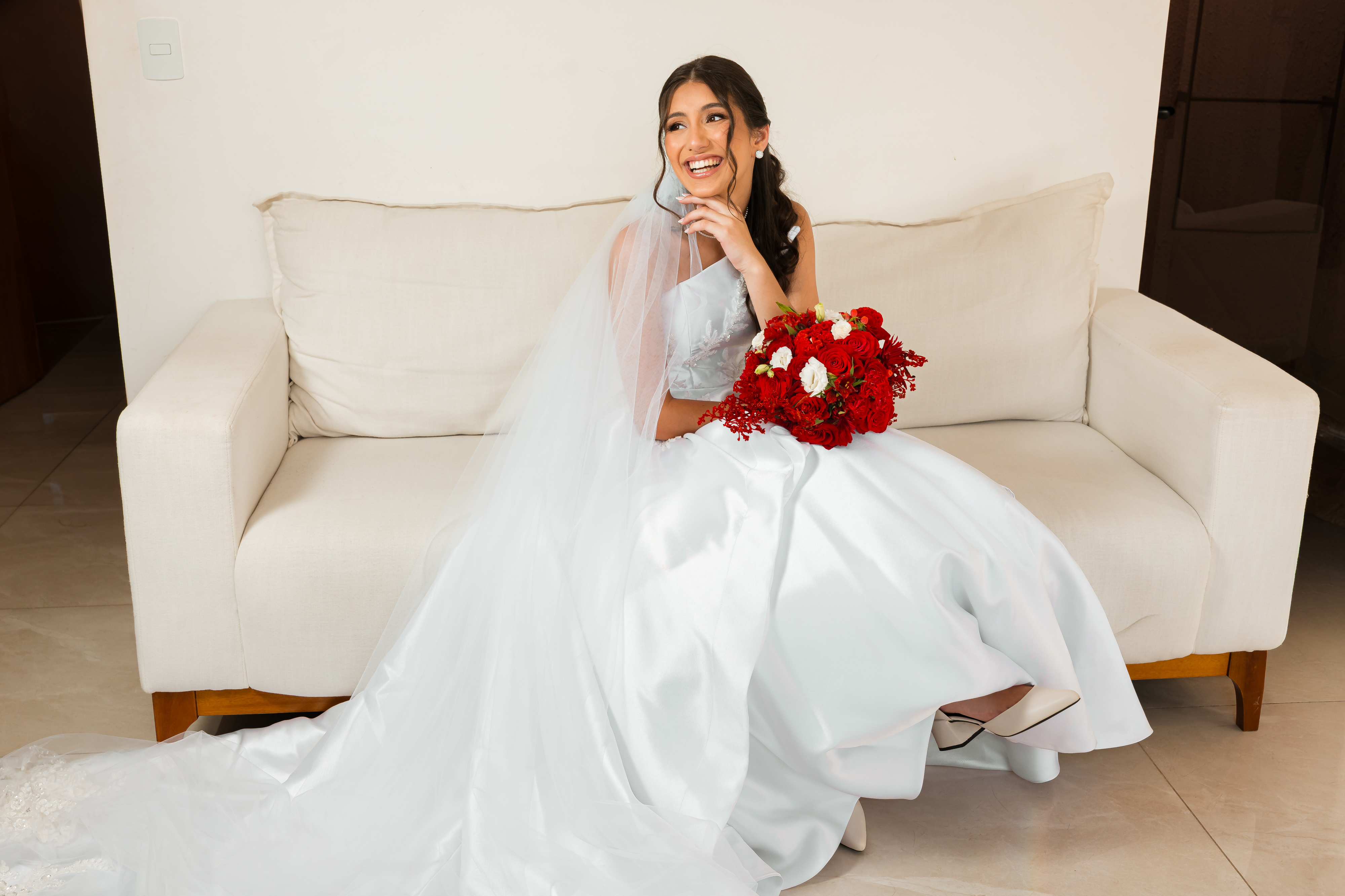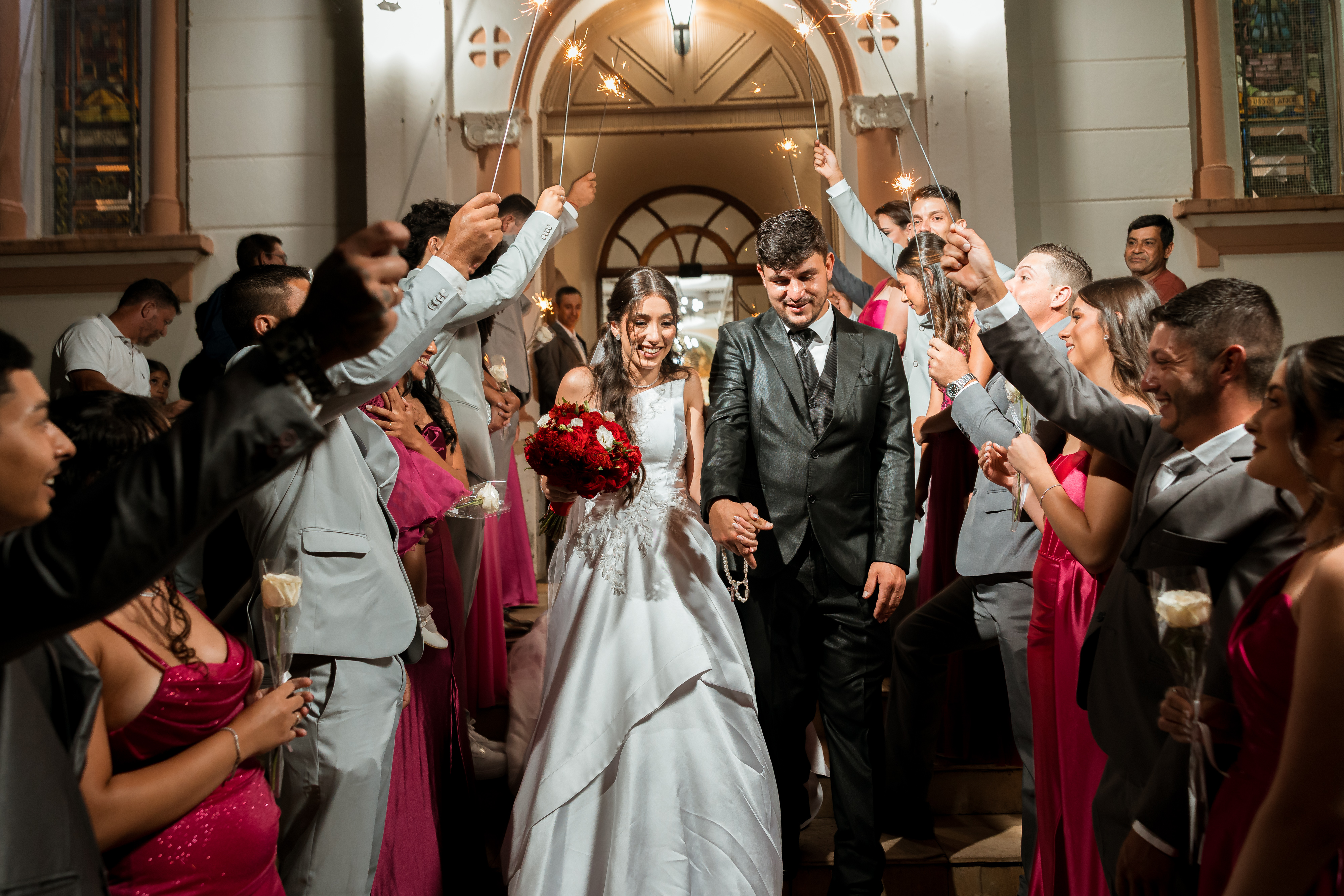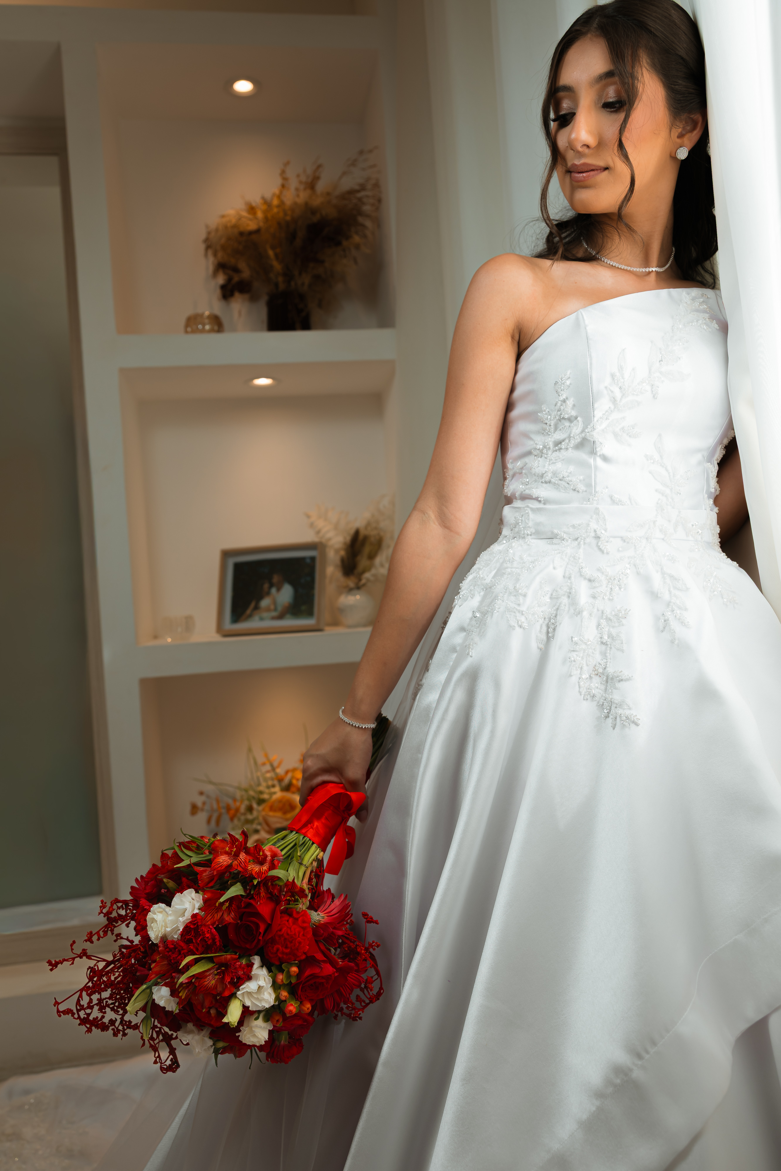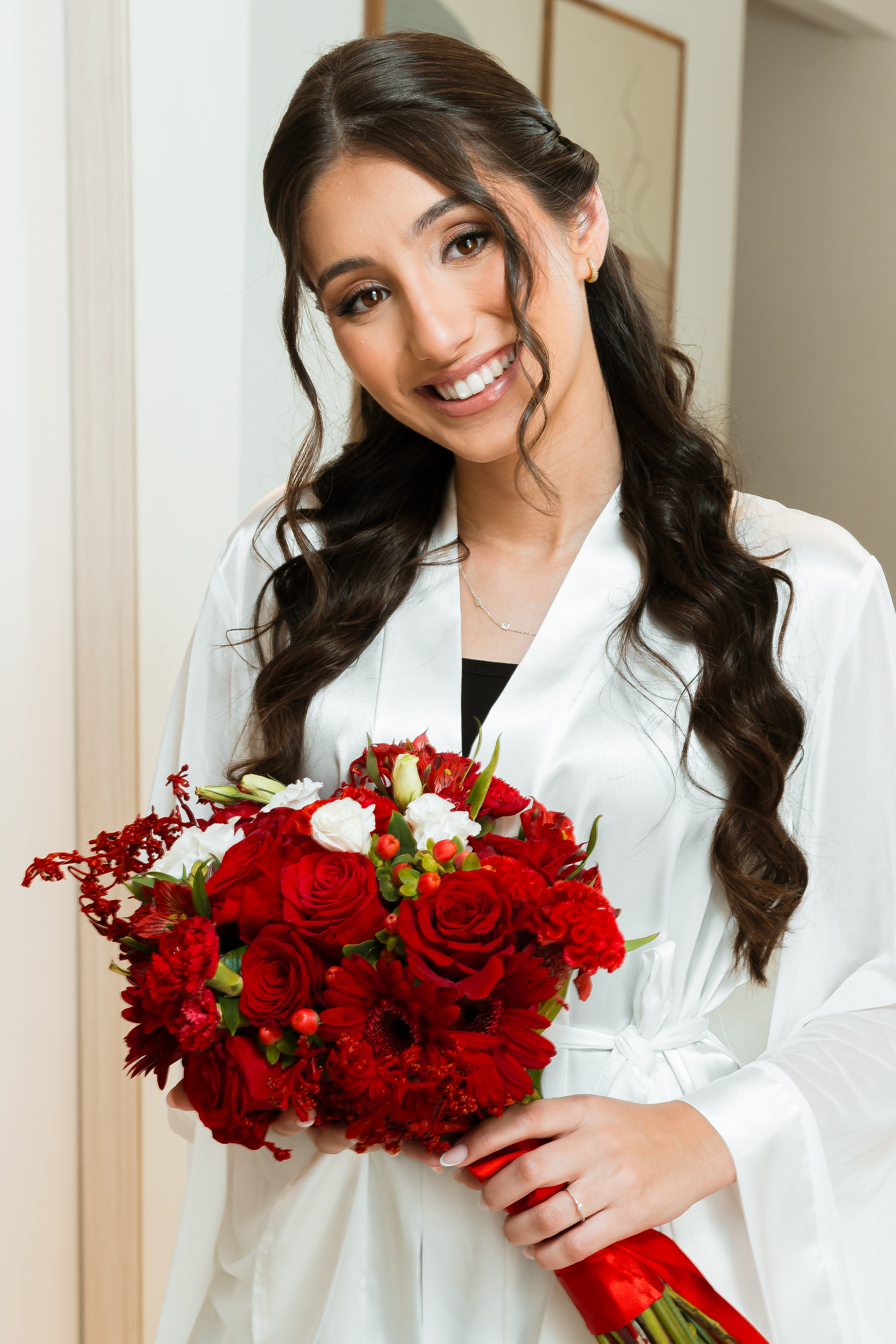 Por isso essa história entra primeiro nesse tempo mais íntimo. O buquê vermelho, os detalhes escolhidos com carinho, os retratos dela pronta e os encontros que antecedem o altar mostram exatamente o que esse dia já era antes da cerimônia começar.