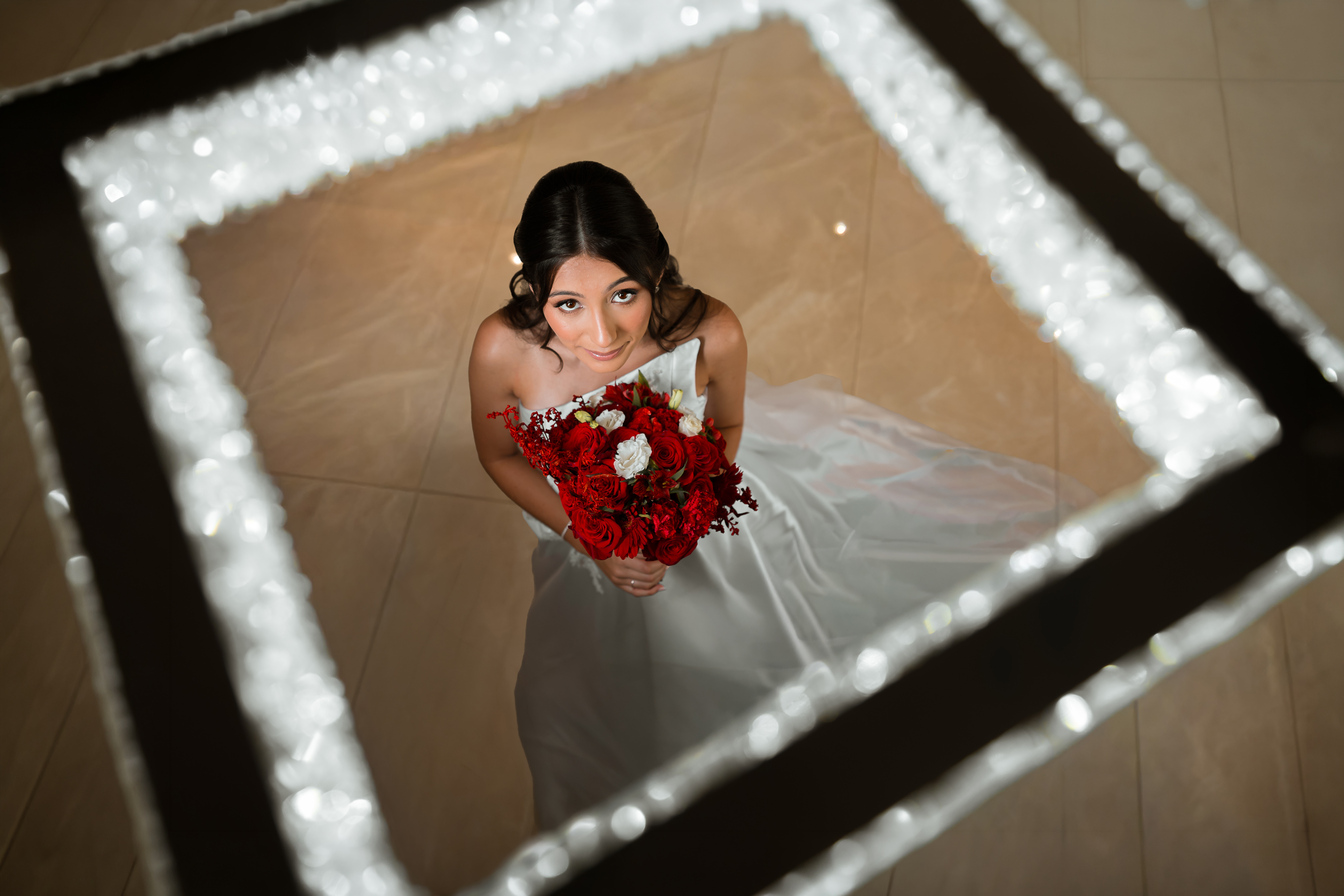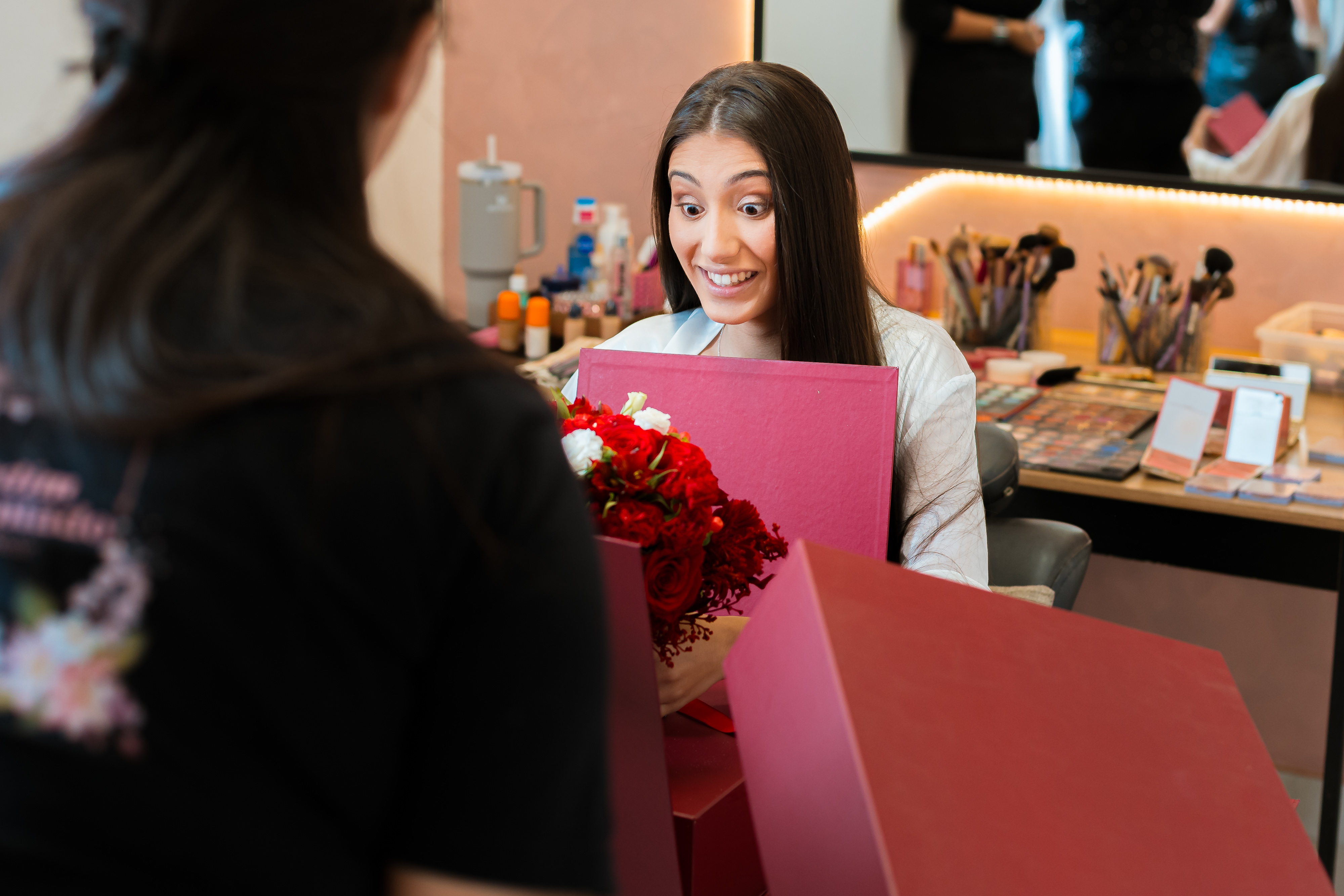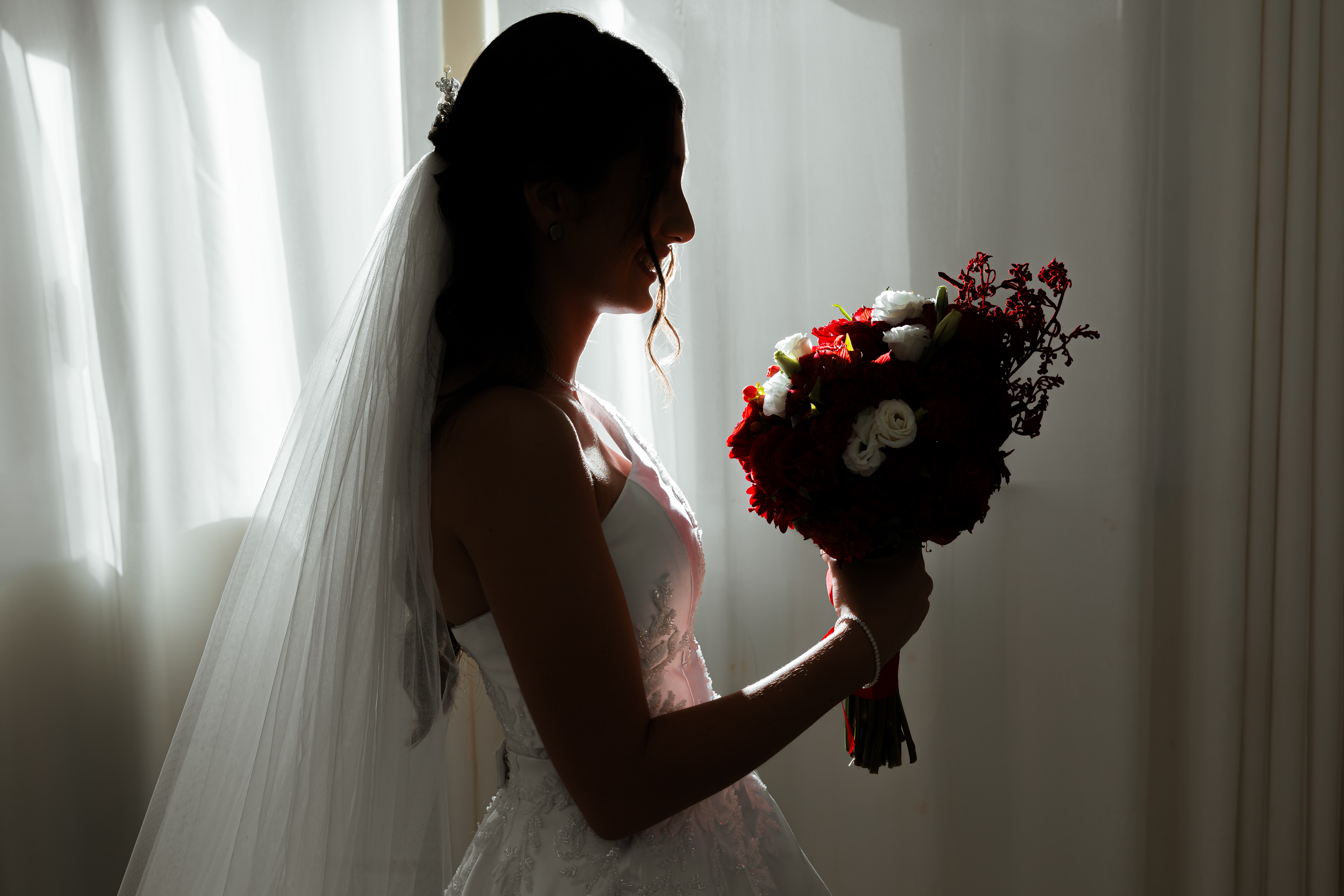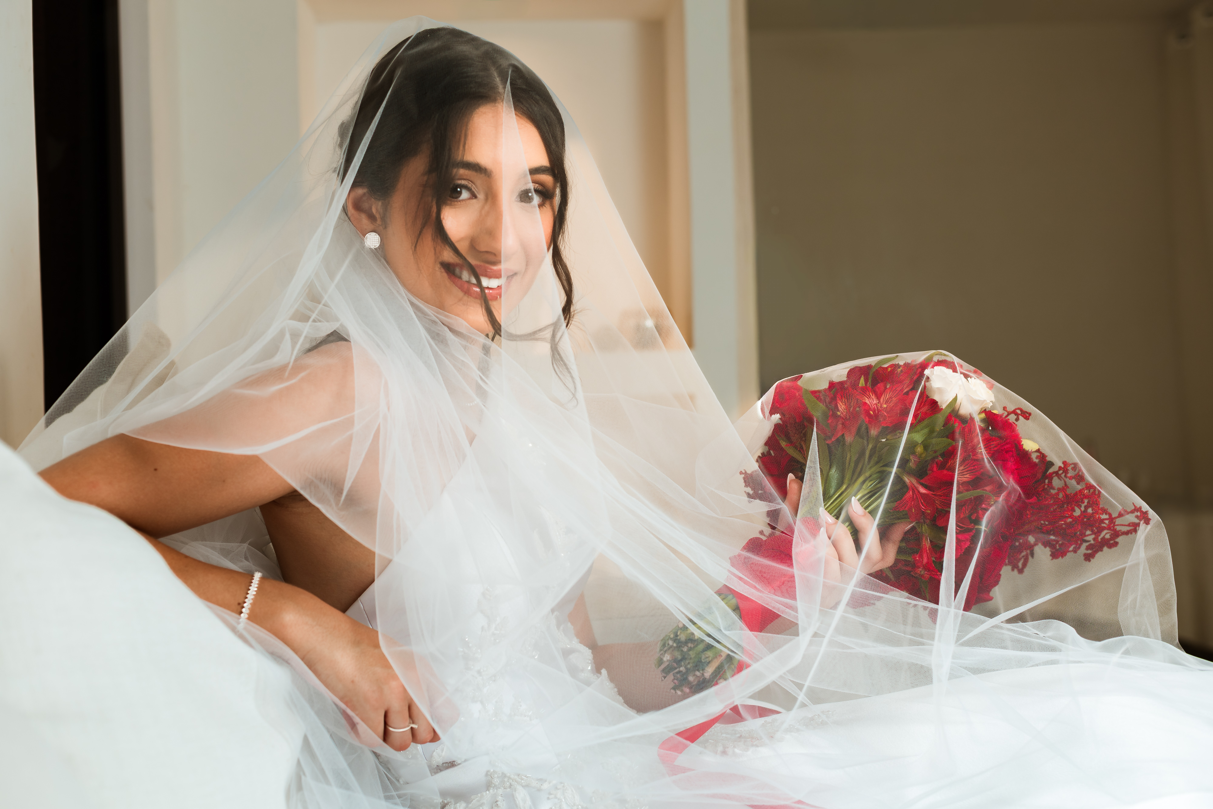 Por isso essa história entra primeiro nesse tempo mais íntimo. O buquê vermelho, os detalhes escolhidos com carinho, os retratos dela pronta e os encontros que antecedem o altar mostram exatamente o que esse dia já era antes da cerimônia começar.
