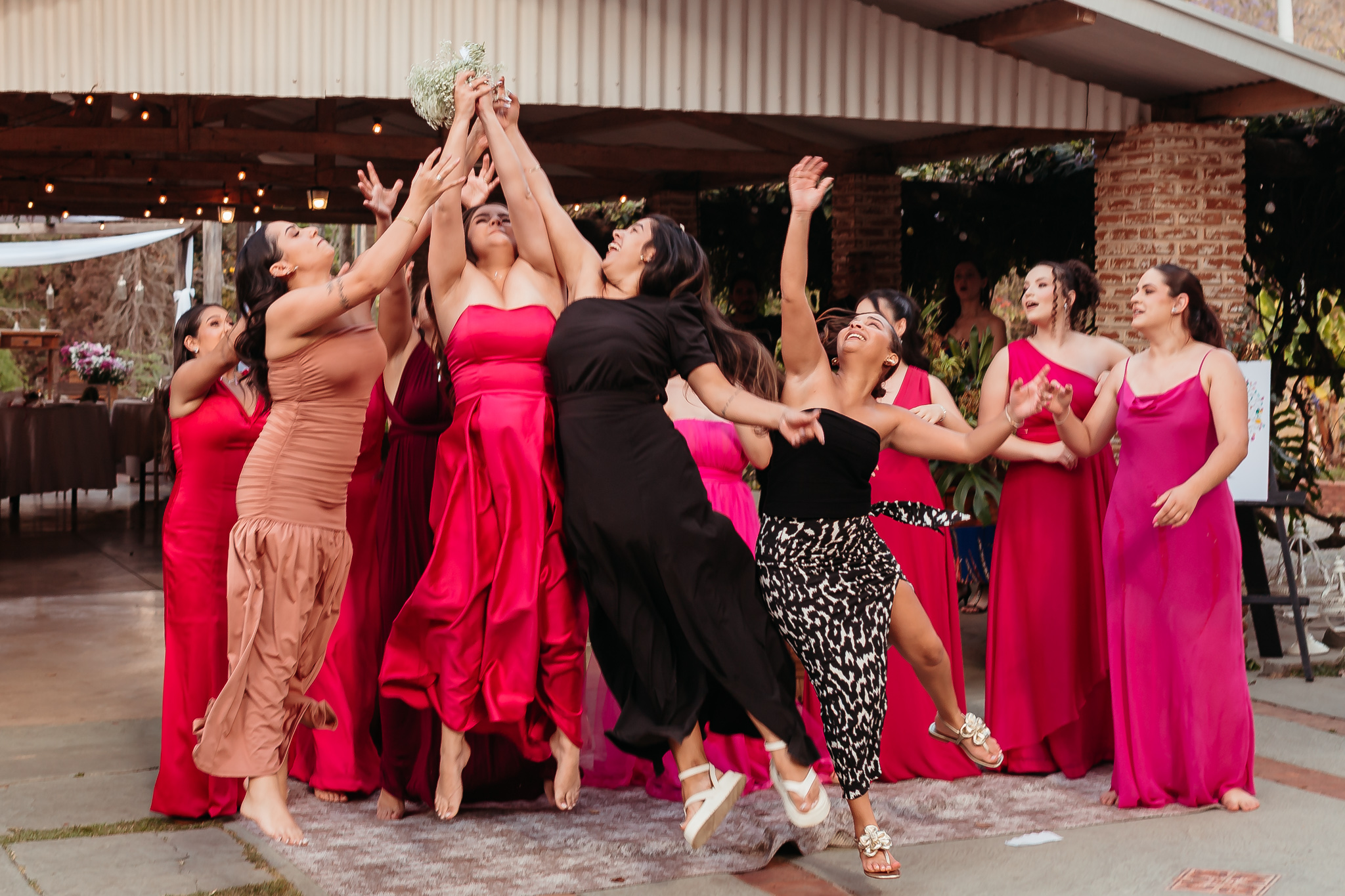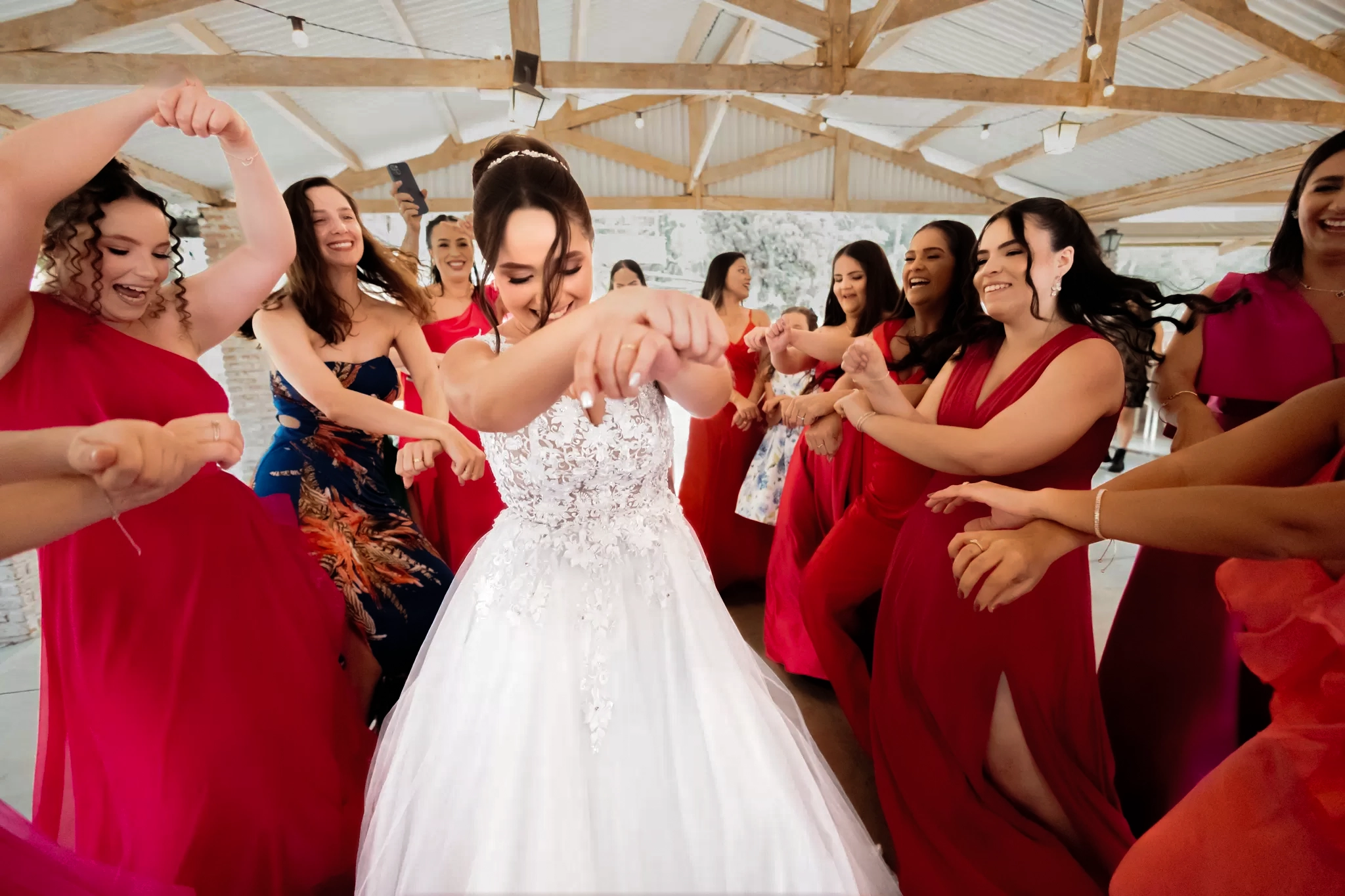 Na festa, o bosque virou cenário de liberdade. Abraços demorados, amigos que chegam rindo e saem suados de tanto dançar. Cada foto nasceu da convivência, não de uma lista de poses.