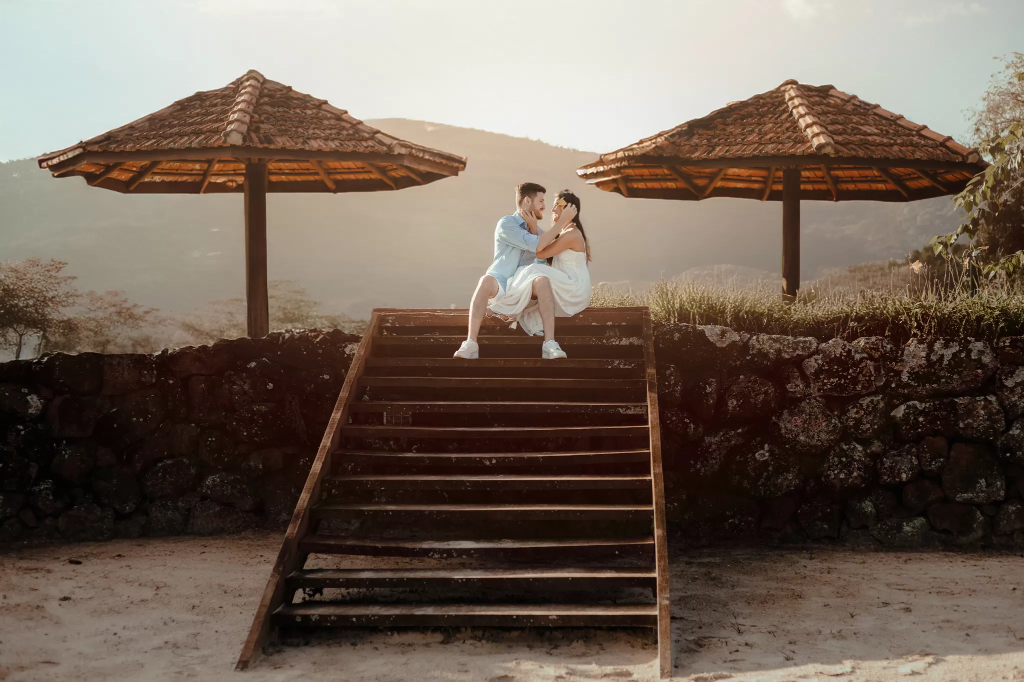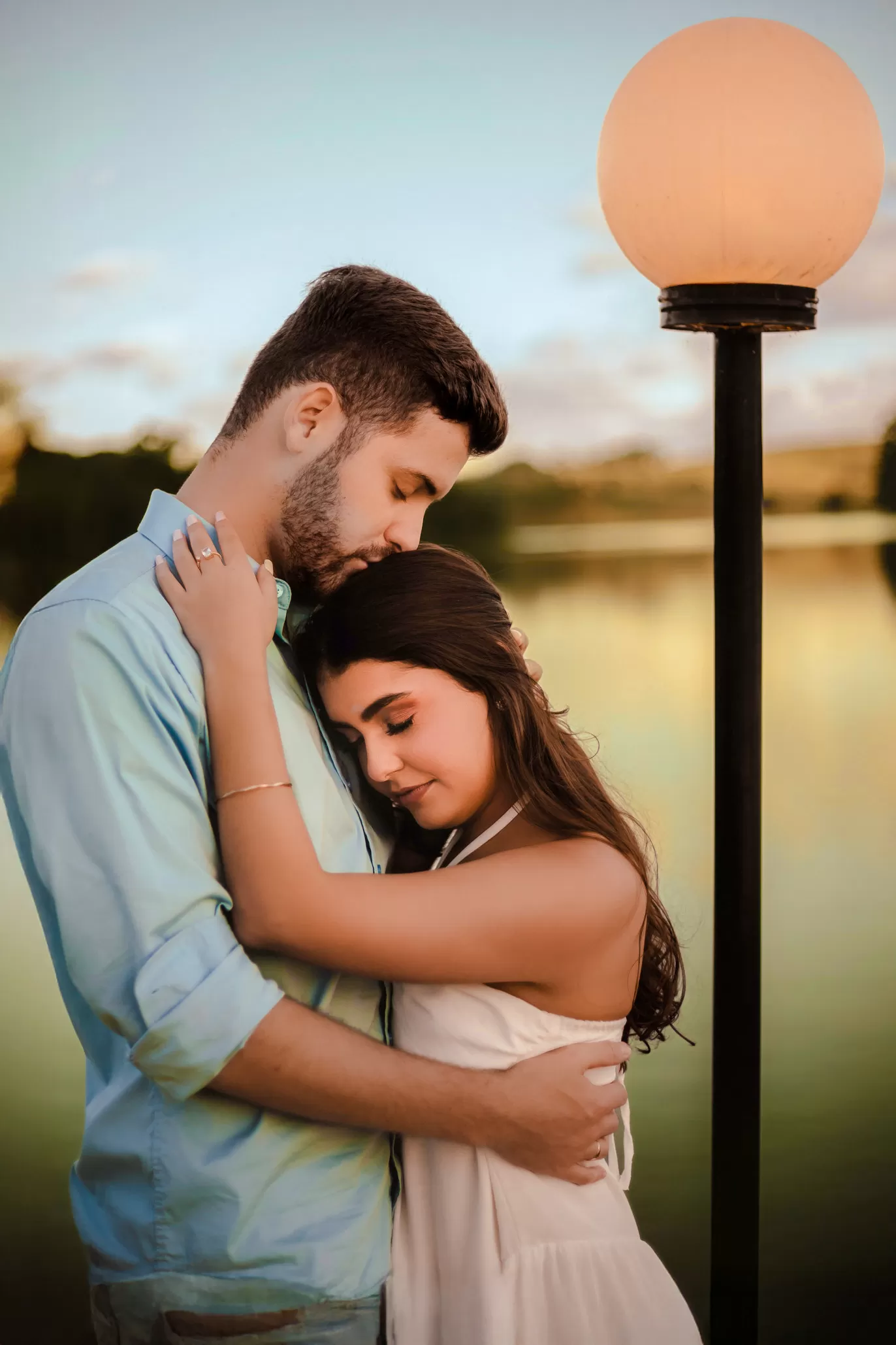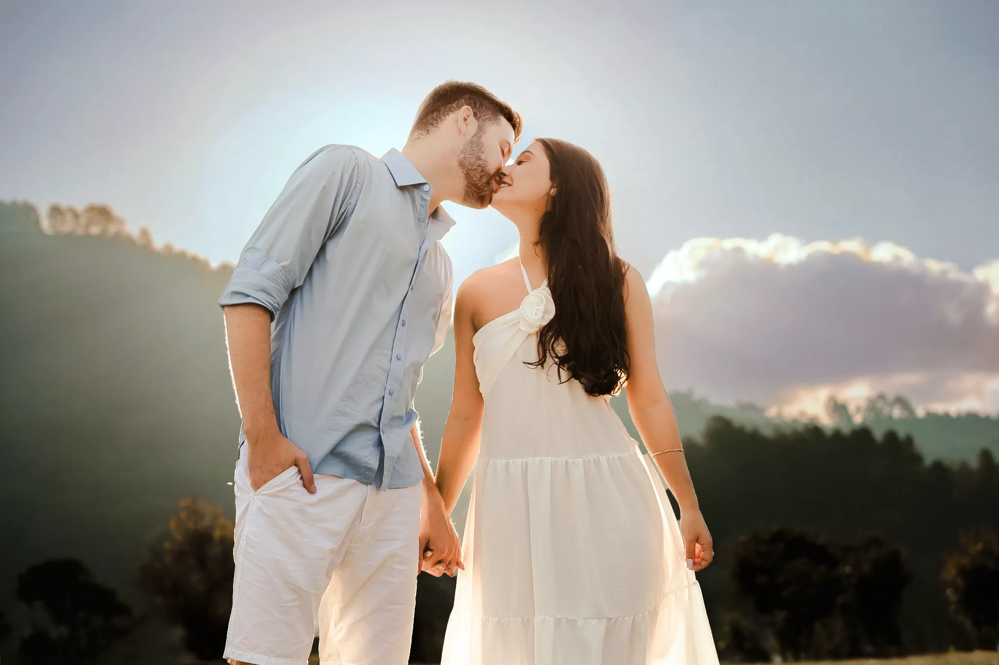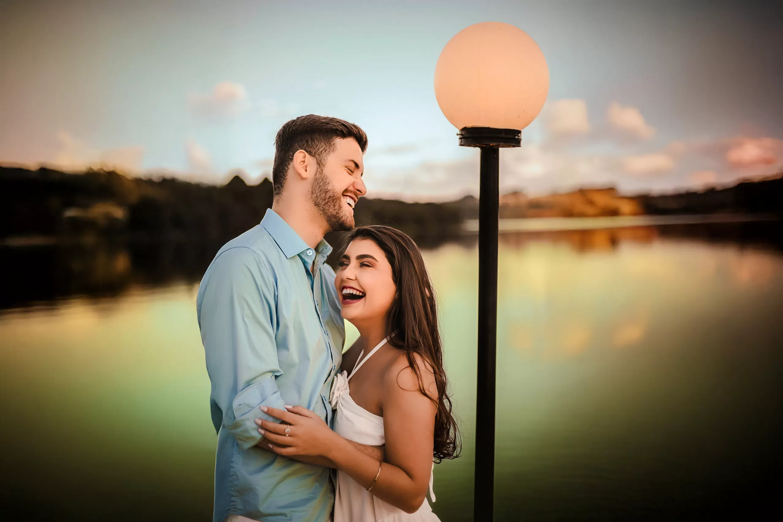 Trabalhei a luz do fim de tarde com composição simples e espaço para os dois. Entre risos e abraços, as fotos nasceram sem pressa, com liberdade para o sentimento aparecer.