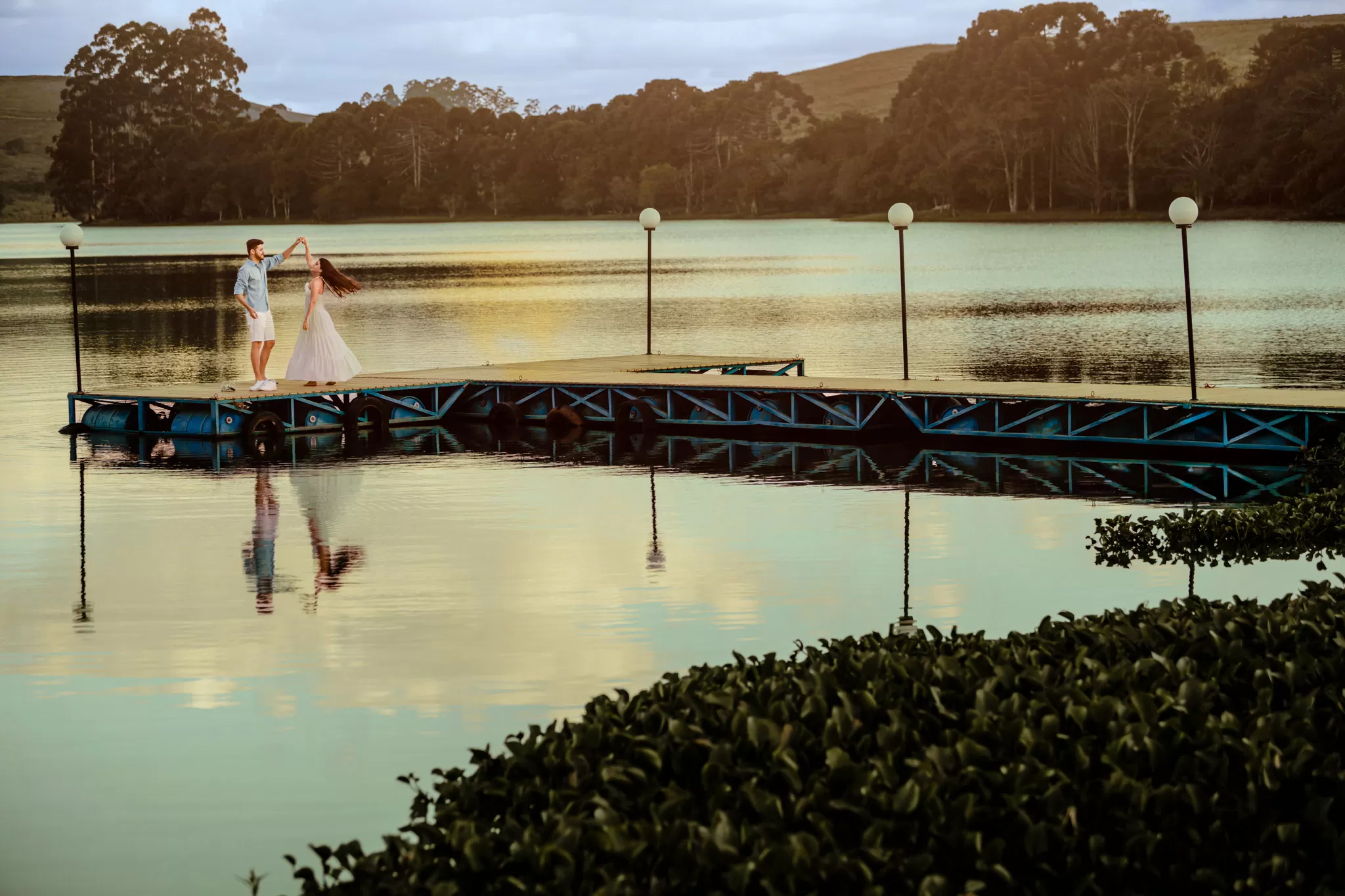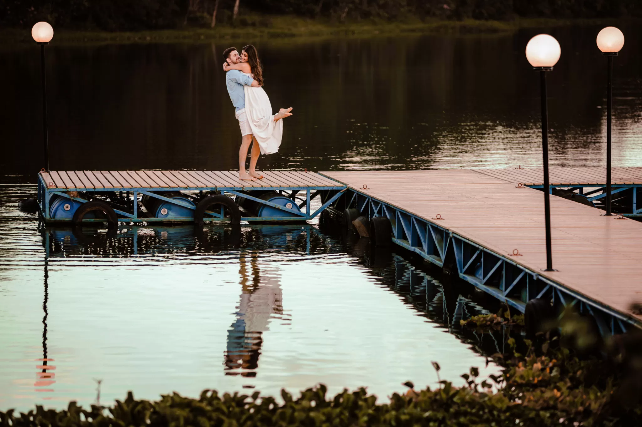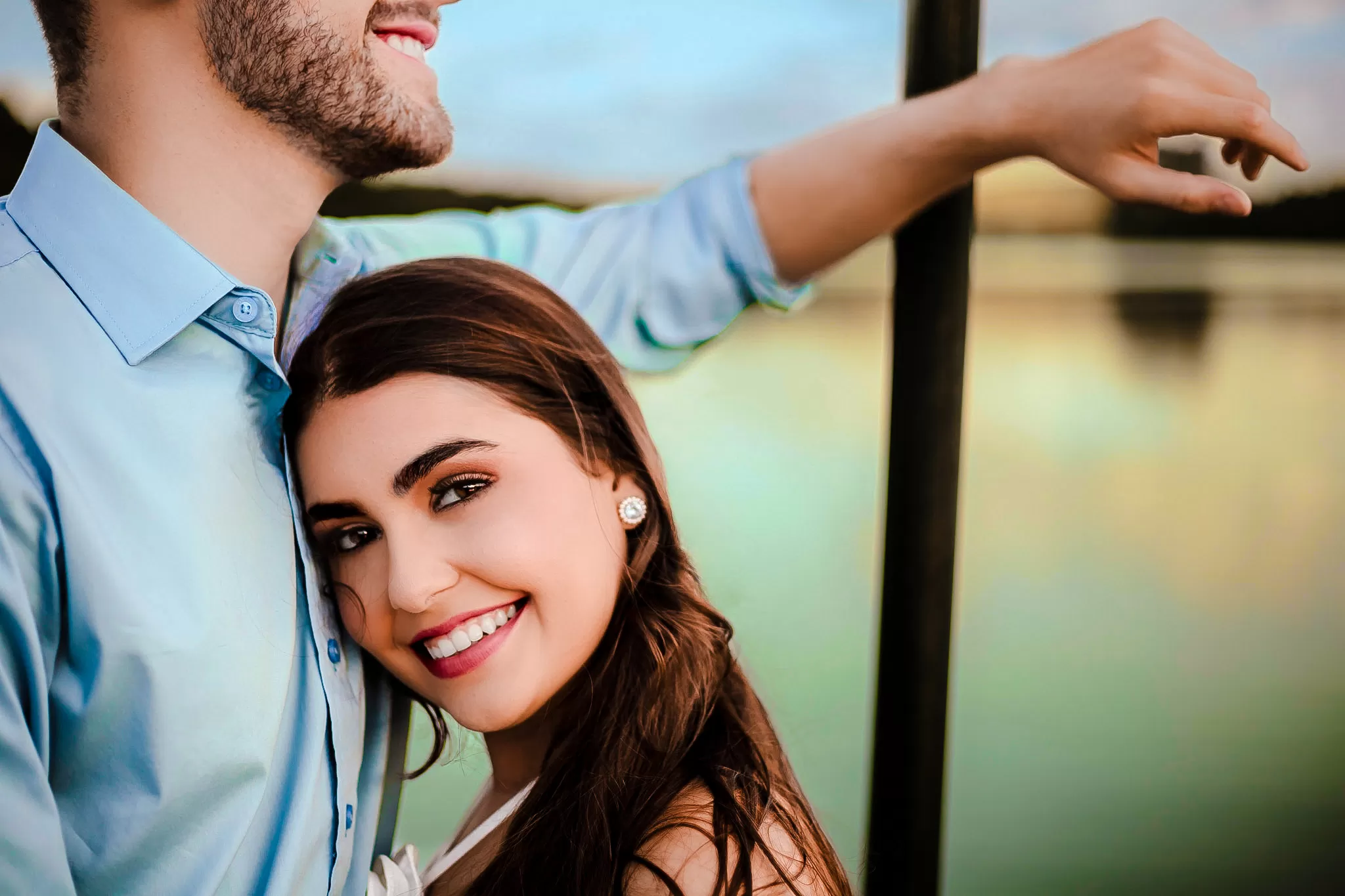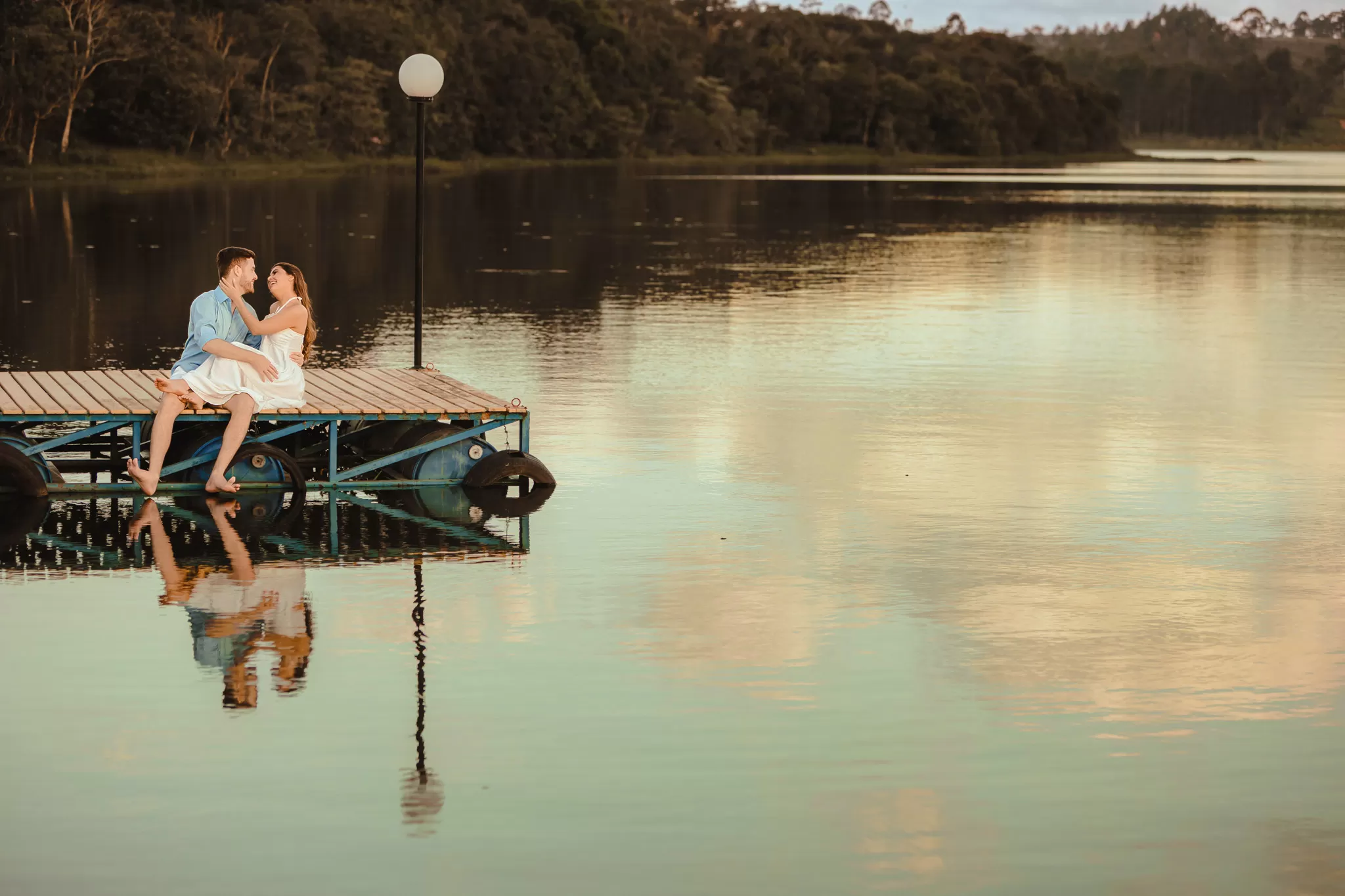 Trabalhei a luz do fim de tarde com composição simples e espaço para os dois. Entre risos e abraços, as fotos nasceram sem pressa, com liberdade para o sentimento aparecer.